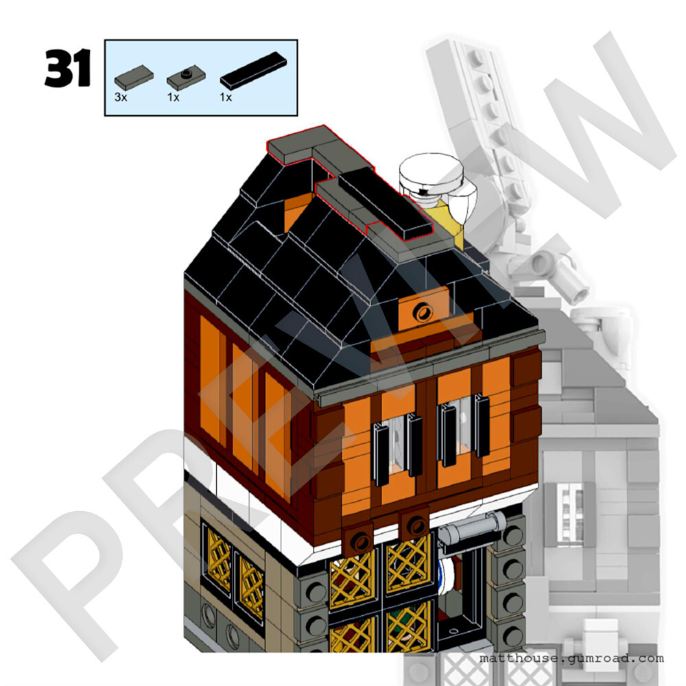 Half-timbered buildings are a characteristic feature of many northern European cities and are home to some of the most famous traditional pubs and taverns in the world. The ever-growing series of the Mini Townhouse Collection is usually characterized by a bold color scheme. In contrast, this model aims to combine the style of the Mini Towhouse series with a more ordinary color scheme, but without neglecting characteristic elements such as the noticeable roof structure. The interior design consists of the tap room with foosball table and dartboard, while the upper floor houses the seating area. Two technic bricks with pin holes on each side connect the model to other sets of the Mini Townhouse Collection.